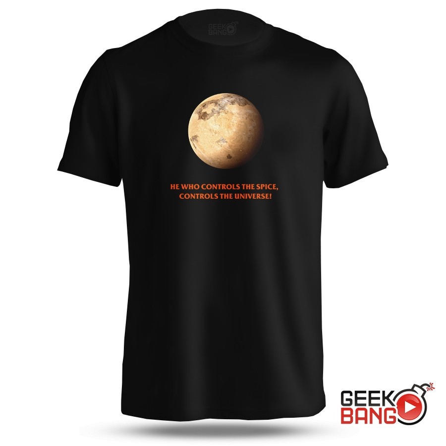 Triko s motivem planety Arrakis a legendárním citátem "Kdo ovládá koření, ovládá vesmír!. Ve spodní části jméno autoraPotisk v HD kvalitě.